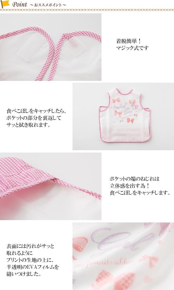 食べこぼしによるお洋服への汚れを防止します☆表面に水を通さない素材を使用。ポケット部分を裏返し、サッとふくだけでお手入れも簡単♪