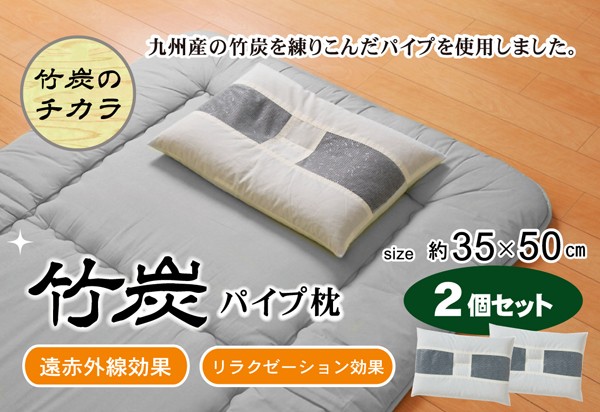 【商品名】 枕 ピロー 国産竹炭パイプ入り 『竹炭パイプ枕』 2個組 約35×50cm 【ジャンル・特徴】 通気性がよく熱がこもらない。竹炭パイプのまくら マクラ ■サイズ・色違い・関連商品■『竹炭リバーシブル枕』単品 約43×63cm■『竹炭パイプ枕』単品 約35×50cm■『竹炭リバーシブル枕』2個組 約43×63cm ■『竹炭パイプ枕』2個組 約35×50cm [当ページ]関連商品の検索結果一覧はこちら 竹の子の産地である福岡県八女郡立花町産の竹炭を練り込んだパイプを使用しています。竹炭には(1)遠赤外線効果(2)リラクゼーション効果などがあります。パイプ使用のため通気性がよく、熱がこもらず心地よくご使用できます。※ファスナー式で中材(パイプ)の交換、高さ(量)の調節が可能です。ご家庭で簡単にパイプが洗えます。■商品スペック【サイズ】約35×50cm 2P【原産国】:日本製(側=中国製)【素材】:側地=綿100% メッシュ部分)ポリエステル100% 中材=竹炭練り込みポリエチレンパイプ(約1.1kg)【洗濯表示】30℃以下の水温で、弱い手洗いがよい。(洗濯機は使用できない)【配