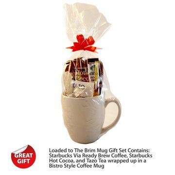 EXCELLENT GIFT====Loaded to The Brim Mug Gift Set Contains: Starbucks Via Ready Brew Coffee, Starbucks Hot Cocoa, and Tazo Tea wrapped up in a Bistro Style Coffee Mug