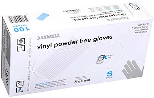 Product Description Daxwell vinyl powder free gloves are 100% powder free. They comply with FFDCA standards for use in food service and provide greater dexterity and protection than poly gloves. They are ambidextrous which allows each glove to be used for either hand. Ergonomic design. Tactile handling. Excellent touch sensitivity. Small size. Clear color. 0