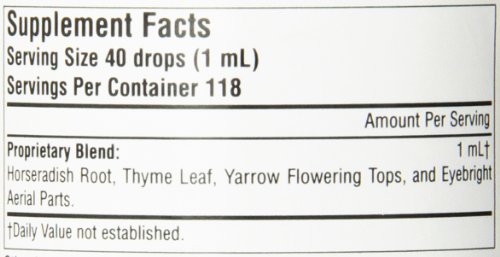 -. Feature : A spicy and pungent sinus formula for supporting the free flow of mucus and facilitating normal breathing / A blend of horseradish root, thyme herb, yarrow herb, and eyebright herb / Effects of these herbs are similar to what we commonly experience when eating horseradish or drinking a hot cup of ginger tea / Yarrow, thyme and eyebright are also rich in flavonoids, which help to stabilize mast cells and thereby reduce the release of histamines / 41 drops (1 ml) every hour as needed, in water, taken orally, reducing dose as approP.R.Iate, or as recommended by your health care professional