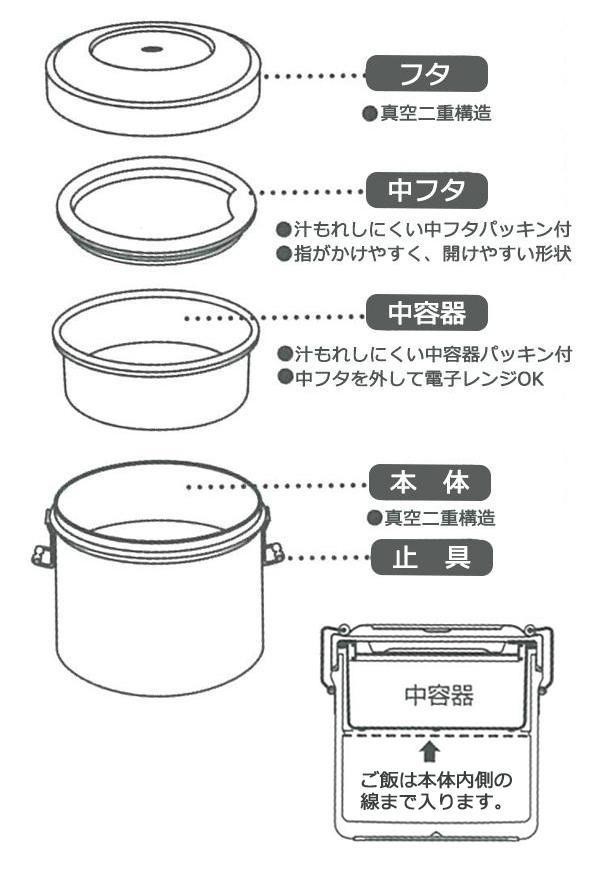 ステンレスの厚みを薄くし、軽量化を実現!本体とフタは真空二重構造で、優れた保温力。本体外側には、汚れにくいクリアコーティング加工を施しています。中フタと中容器には、汁漏れしにくいパッキン付き。中容器は中フタを外して電子レンジOK♪タイト式止具なので収納もスッキリ! |