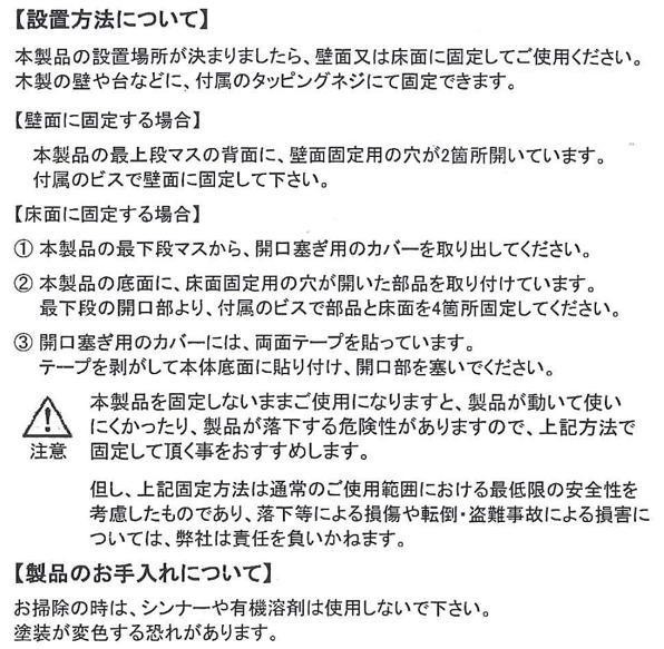 | サイズ | 外寸:W455×D300×H600mm、1マスあたりの内寸:約W166×D260×H120mm 個装サイズ:48×32×62cm |