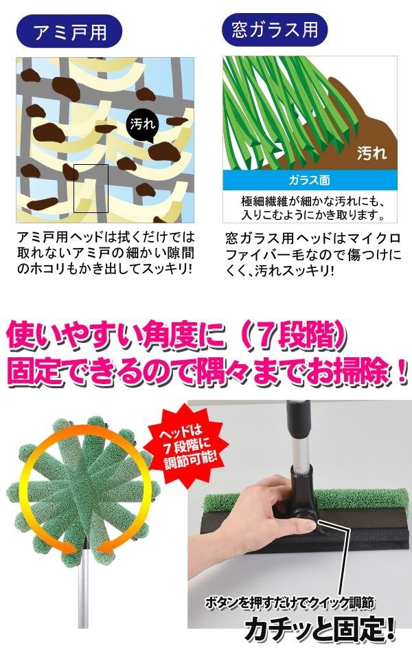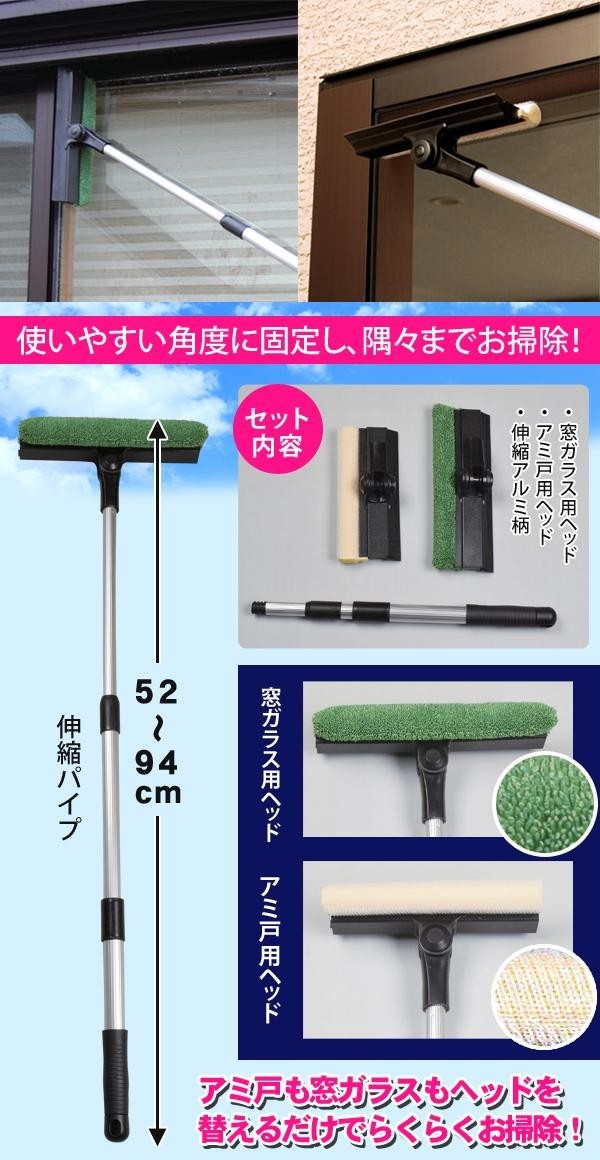 | セット内容 | 窓ガラス用ヘッド、アミ戸用ヘッド、伸縮アルミ柄 |
