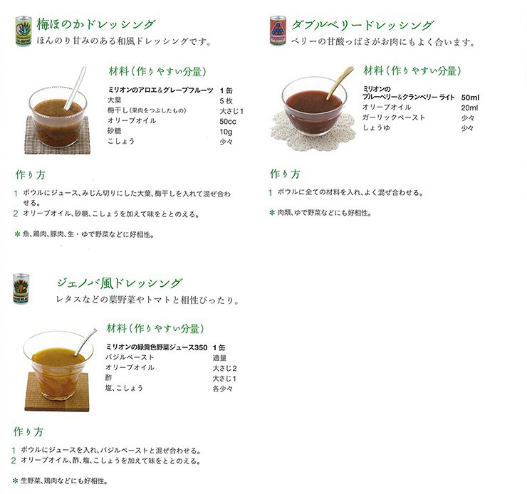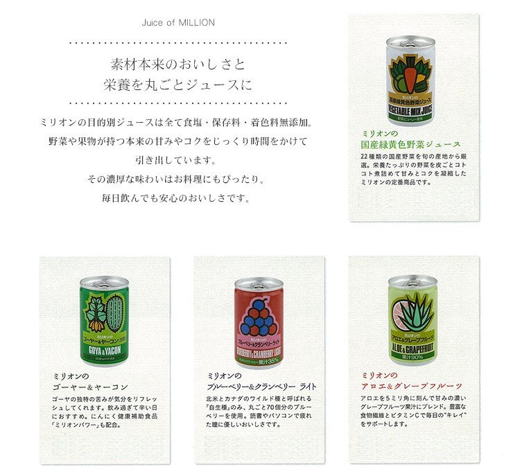 (1)国産緑黄色野菜ジュース[温野菜ピューレ製法の濃厚なジュース]×12本(2)アロエ&グレープフルーツ「「アロエ葉肉と甘みの濃いレッドグレープフルーツ」×6本(3)ゴーヤー&ヤーコン「長寿野菜とオリゴ糖の健康ドリンク」×6本(4)ブルーベリー&クランベリー「1缶に約70個のブルーベリー」×6本ミリオンの健康飲料がすべて試せるお得なセットです。防災、野菜高騰時のストックとしても!