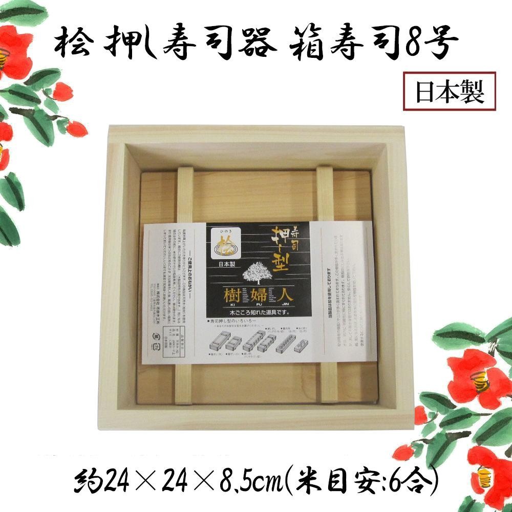 ご飯離れの良い桧を使用。業務用としても使える品です。ご家庭での祝いの日に多くのお客様を喜ばせる箱寿司用調理道具です。 製造国:日本 素材・材質:国産桧 商品サイズ:約24×24×8.5cm 重量:約860g 仕様:米目安:6合食洗機使用不可 ※サプライヤー直送品【商品名】市原木工所 日本製 樹婦人 桧 押し寿司器 箱寿司 8号 041216