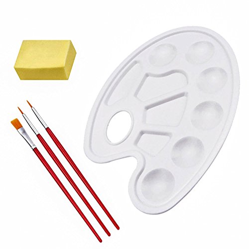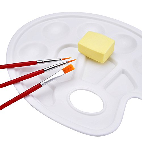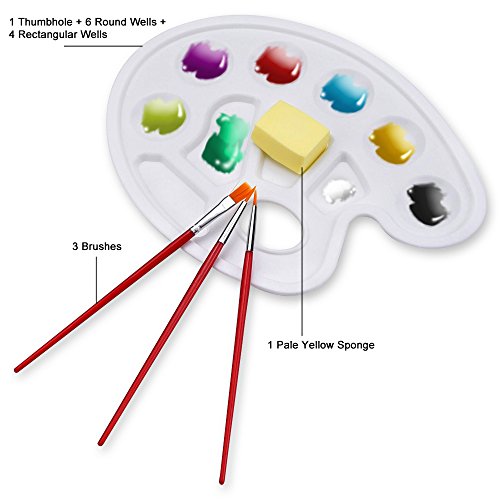 -. Feature : Package includes 1 * palette, 3 * brushes and 1 * sponge in one set / This paint tray palette is sturdy and well designed with a thumb hole, 6 round wells and 4 rectangular wells / Suitable for all water based media, especially for acrylic or watercolor paints / Good material and soft sponge; Easy to clean and use / Good for amateur painters, art classes/ lessons, small paint projects, kid's painting projects/ parties