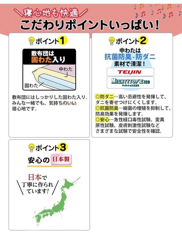 ■ 品質/掛布団・側生地:ポリエステル85%、綿15%、詰め物:ポリエステル100%、敷布団・側生地:ポリエステル85%、綿15%、詰め物:ポリエステル100%、固わたポリエステル100%
