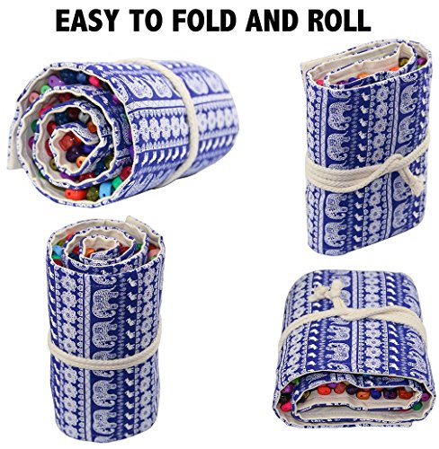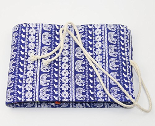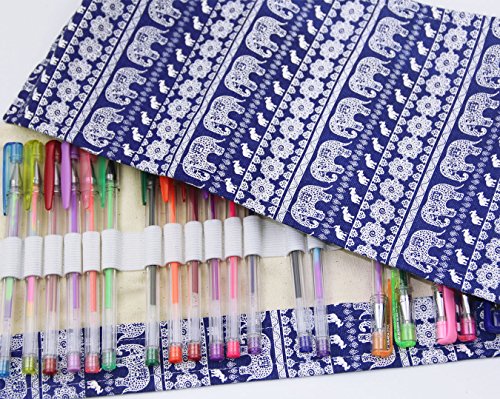 Hz.Codelo Canvas Gel Ink Pen Wrap Roll Case Pouch,Travel Multi-purpose Holder Organizer Hold for 48 Gel Pens,Ultra Fine Permanent Markers (No Pens Included)-Blue elephant