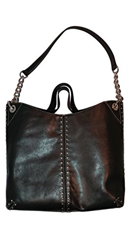 -. Feature : Leather, silver toned hardware and studs / Snap closure / Dual handles with 7'' drop, Shoulder strap with 15'' drop / Lined interior, full zip pocket, 4 open multi-purpose pockets / Approx measurements: 14"L x 14"H x 4.5"D
