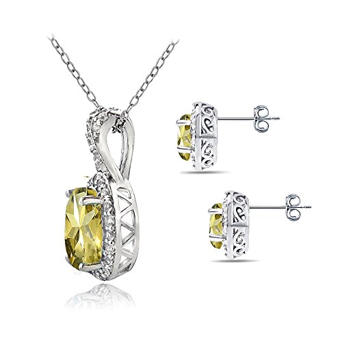 This stunning jewelry set includes stud earrings featuring 7x5mm oval gemstones set in a polished halo setting with surrounding white topaz stones and a pendant necklace featuring an oval 9x7mm gemstone with the "X" design bale showcasing white topaz gemstones for an added touch. The set is entirely crafted of fine sterling silver, nickel & tarnish free. The earrings are secured by post with friction backs and the necklace secures with a spring-ring clasp. The necklace includes an 18 inch rolo chain. Necklace Dimensions: 18 inches in length, 10mm wide, and 18.5mm height. Earrings Dimensions: 10.5mm in length and 8.5mm wide.