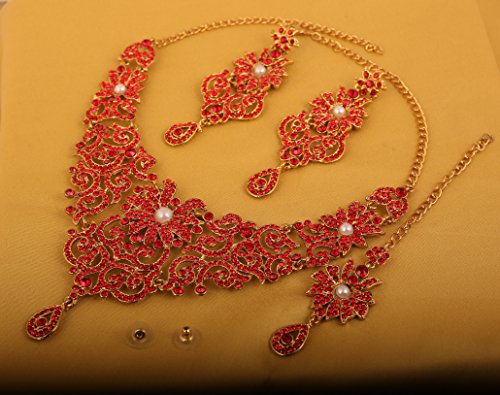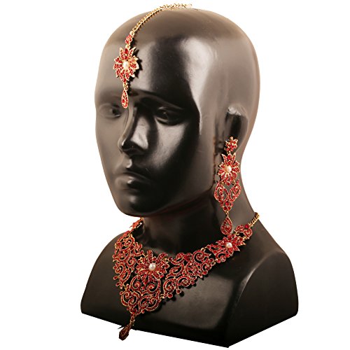 Alloy metal, traditional Indian royal look attractive filigree red rhinestone and white faux pearls grand bridal necklace set with long earrings and Mangtika. Embellished with rhinestones in silver tone.