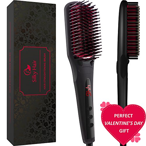 Studio : Silky Hair Publisher : Silky Hair Binding : Misc. Product Description The size of the 2-in-1 portable hair straightening brush is 10,5", the handle is 5,5", and the head of the brush is 5". Good solution for travel, easy to handle and store. Dual Voltage: Pro brush comes equipped with a double ionic generator, which makes your hair silky straight. MAX temperature is 450 ℉.