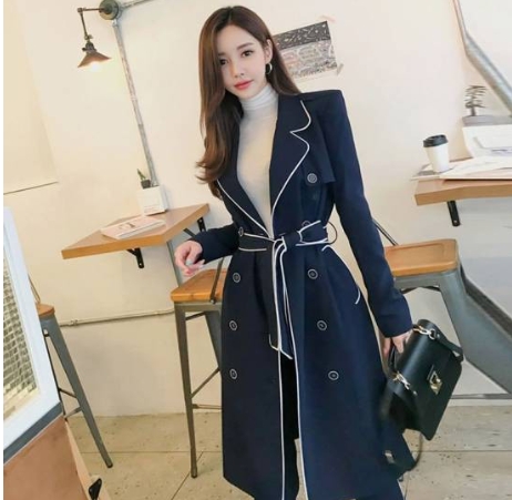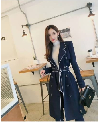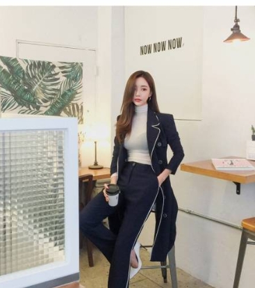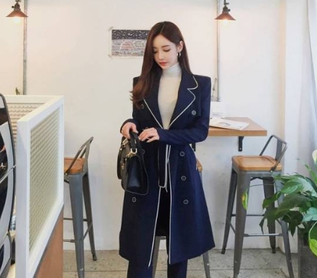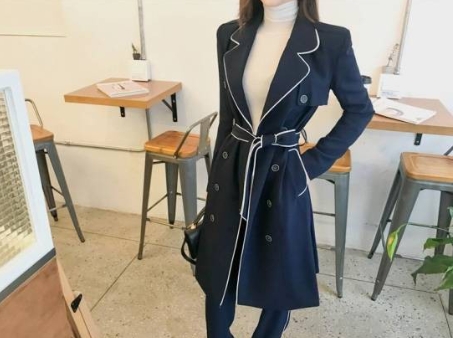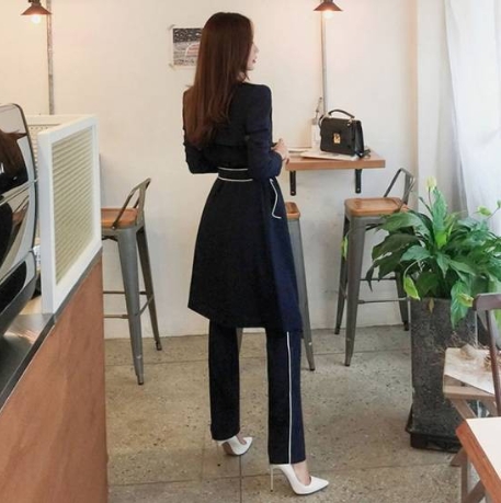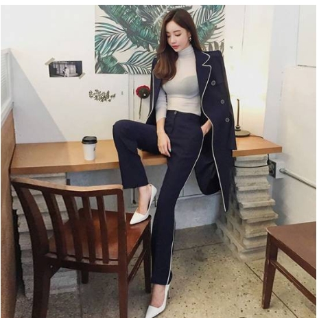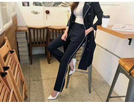 ホワイトのライン使いがアクセントになった、ネイビーのパンツスーツです。