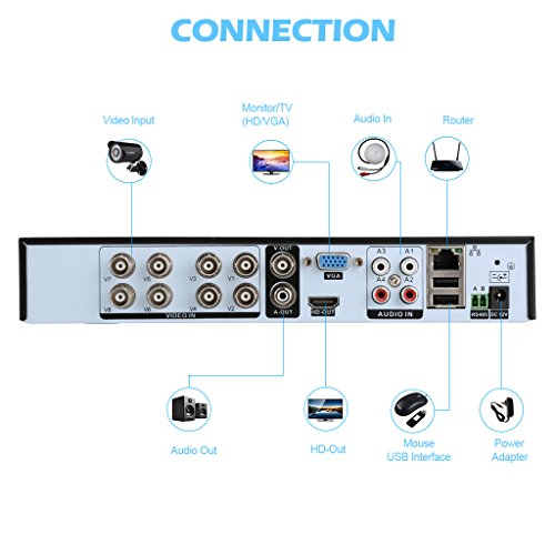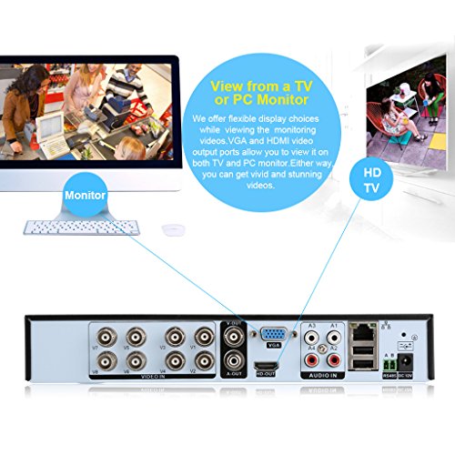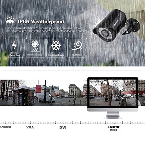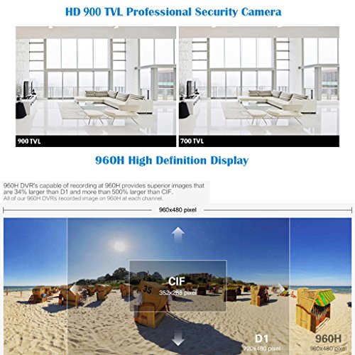 -. Feature : 【What You Get】Floureon 1x 8CH 960H DVR + 4x 900TVL camera security kit with 1 year warranty and friendly customer service. / 【Main Support】Motion detection, send alarm information by email; 8 channel simultaneous live viewing via your smartphone; Capture and record in your smart phone; Cloud system for remote access/support HDMI output; P2P technology, the CCTV DVR can be linked through the internet without any complicated port mapping. You'd better use seagate or west digital brand hard drive, it is more compatible with DVR. / 【Waterproof】IP66 means this camera is suitable for outdoor locations. Excellent material of metal shell ensures its waterproof and vandalproof which brings about a convenient and safe life. Easy to install, simple to use. Setup a CCTV DVR security system to protect your home, shop and office. / 【Resolution】960H DVR provides true color high definition image. 900TVL resolution camera provides clear and accurate video footage both day and night. IR-CUT filter provides true color image during daytime. IR LEDs P.R.Ivide high quality B/W pictures. Backup via USB drive. Remotely activate and view via the internet from anywhere and anytime. PC surveillance software and mobile phone client are included, easy for remote network surveillance. / 【DVR Video】System: PAL/NTSC switch selectable; Input: 8CH BNC interface; Output: 1CH BNC interface; HD Output: HDMI (1920x1080); VGA Output: 1xVGA(1080P,1440x900,1280x1024,1024x768 Selectable); Remote Access: Cloud system for remote access, NO port mapping; Video Resolution: 8 CH 960H(PAL: 960x576, NTSC: 960x480); Recording Mode: Schedule, Manual, Motion Detection Alarm.