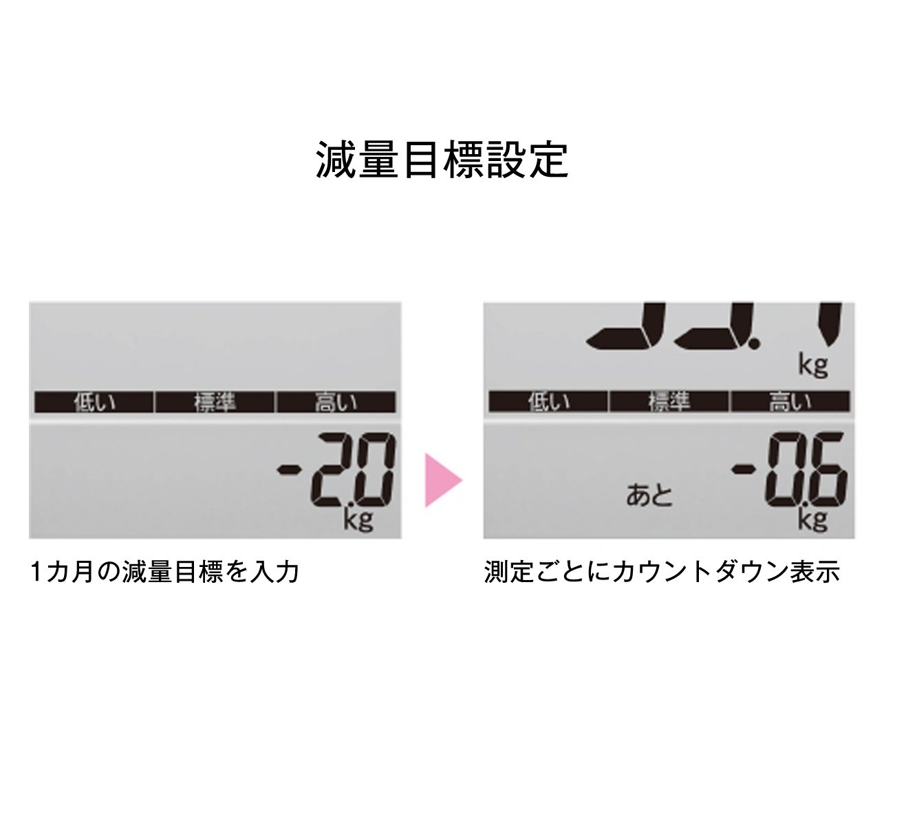 ■ Body Composition Meter ■ Automatic Power On & User Identification "As much Speed ID" ※ Up to 4 people can be registered ■ Weight reduction goal set and countdown display.
