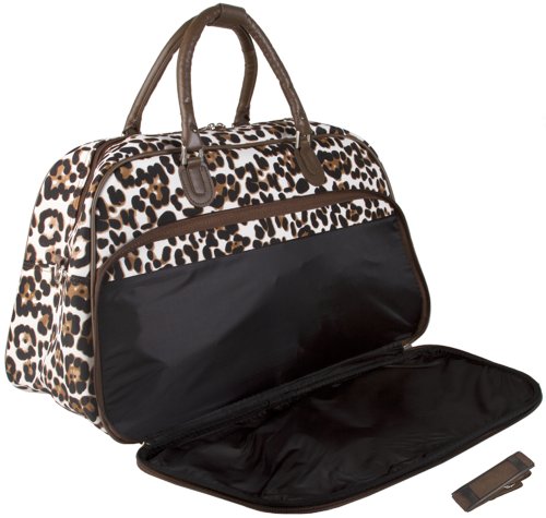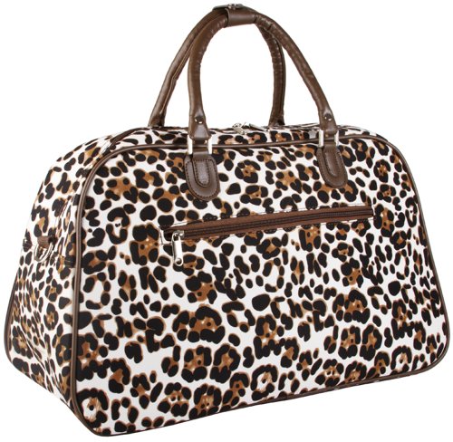 -. Brand : World Traveler -. Department : womens -. Feature : Pockets: 2 exterior, 3 interior / Adjustable and removable shoulder strap / Spacious top-zip main compartment / Silver pewter zipper pullers and accessories / Interior pockets, one sized and two open interior -. ProductGroup : Apparel -. ProductTypeName : LAGE -. Title : World Traveler Animal Print Collection 20-inch Carry On Travel Duffle Bag