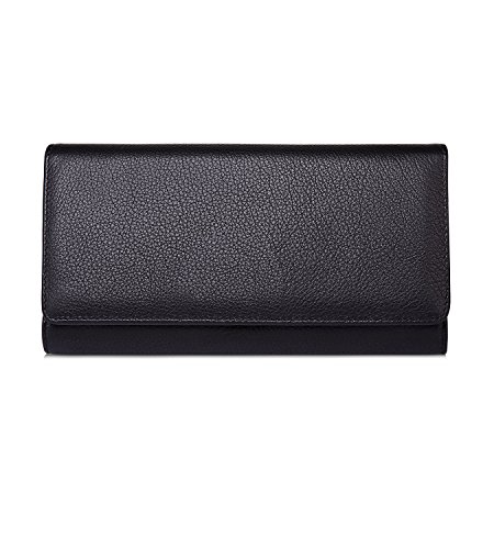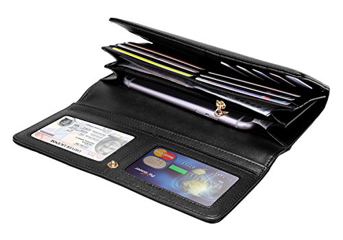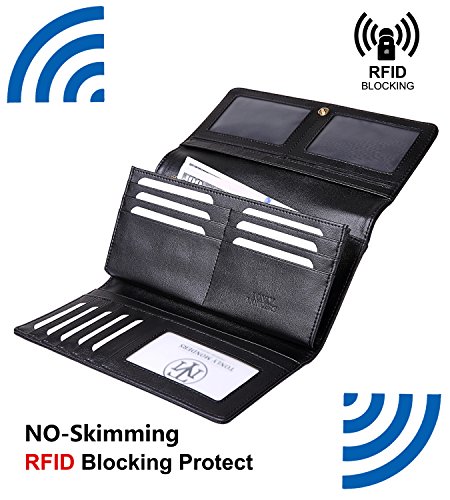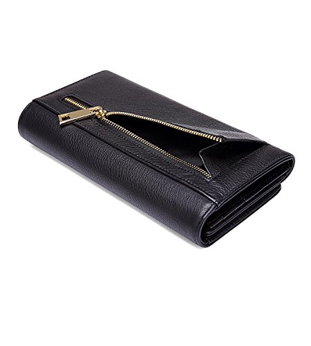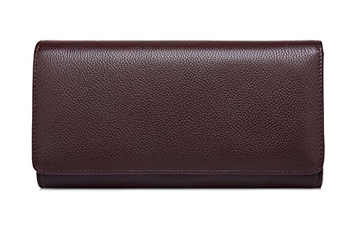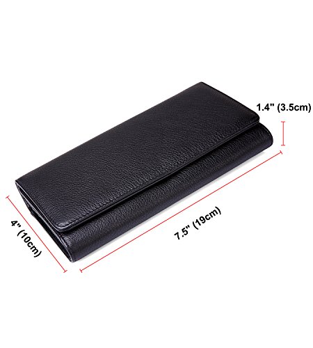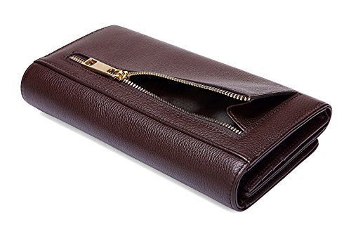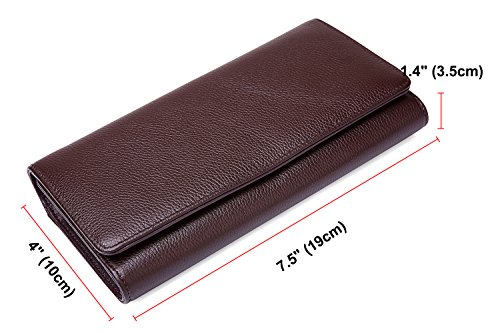 -. Feature : RFID BLOCKING KEEPS SECURITY AND SAFETY - Tested for 13.56 MHz Frequency in which credit cards and debit cards operate, RFID blocking wallet can prevent your card account number and related valued data from being reading, protect your P.R.Ivate information security / TRI-FOLD DESIGN AND VINTAGE LOOK - Clear Structure and Tri-fold design keep things organized well. Soft genuine leather, matches heavy duty metal zipper, makes wallet vintage and timeless. Hidden snap closure easy to open and close, keep all your cards, bills, coins safe / FUNCTIONAL WITH LARGE STORAGE - 14 credit card slots, including 3 ID windows with thumb slide for quick access. 5 open bill compartments and 1 interior zippered pocket. But that's not all - there is also 1 exterior zip coin pocket on the back of wallet. It's a great way for woman to hold all her essentials in order / FULL GRAIN LEATHER - Made from full grain cowhide leather, the leather boasts pebbled textures and a soft hand feel, exquisite sewing craft brings to neat and durable stitching, excellent quality keeps appearance new even after using a long time / IDEAL DIMENSION FITS SMART PHONE - L7.5" * W4" * 1.4", this pocket wallet fits smart cell phone with Maximum size 5.5" * 2.7" *0.29", such as iphone 6s, iphone 5s etc, comfortable to clutch on hand for women