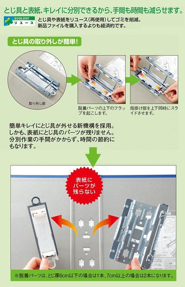 一般書類を大量に収納!!オフィス等での共有ファイルに適しています。とじ具と表紙を簡単に取り外しできるので、再利用・分別廃棄が可能なエコな商品です。 |