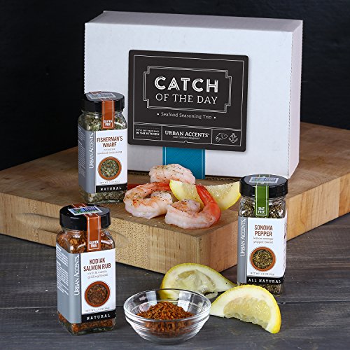 -. Feature : THE PERFECT HOSTESS GIFT: Give this delicious seasoning gift set at your next dinner party. Perfect for any occasion! / KODIAK SALMON RUB: An emerald isle blend of cumin, oregano and sea salt. / FISHERMAN'S WHARF: Versatile blend of lemon, sea salt, garlic, pepper & onion. / SONOMA PEPPER: Fragrant blend of Tellicherry black pepper, garlic, onion with lemon and orange peel. / YOUR CULINARY WINGMAN: Urban Accents focuses on quality, natural, small batch blended creative flavors. Order your own Catch of The Day spice set or buy one as a gift. Just click 'add to your cart!
