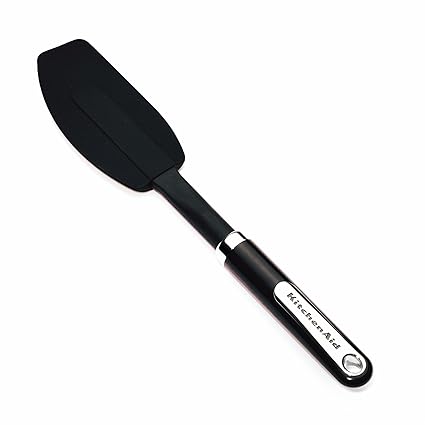 - The flexible silicone head with curved sides is ideal for mixing, scooping, and scraping.