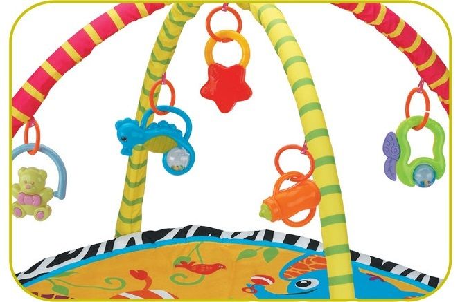 Allow gym play as baby reaches out for the rattles.