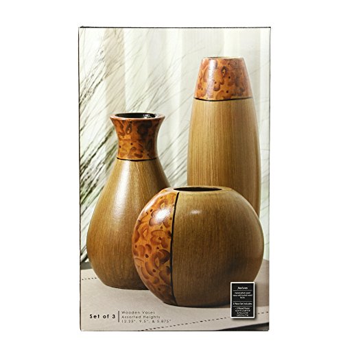 -. Binding : Kitchen -. Brand : Elegant Expressions by Hosley -. Color : Brown -. EAN : 0040338486879 -. Feature : First vase is 12.25" high, second vase is 9.5" high, third vase is 5.75" high / Adds character to any home or office space / Great gift idea for housewarming and other occassions / 1 set of 3 vases per box / Gift boxed -. IsAutographed : 0 -. Label : Hosley International -. Manufacturer : Hosley International -. Model : BS48687WD -. MPN : BS48687WD -. NumberOfItems : 1 -. PackageQuantity : 1 -. PartNumber : BS48687WD -. ProductGroup : Home -. ProductTypeName : HOME -. Publisher : Hosley International -. Studio : Hosley International -. Title : Elegant Expressions Set of 3 Burlwood Vases -. UPC : 040338486879