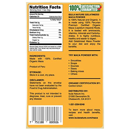 Isula Nature's Organic Gelatinized Maca Powder is a safe and effective Super Food that really works from the inside out, naturally. Maca has been cultivated in the Peruvian Andes for over 2000 years. It was consumed by warriors, athletes and priests in the Inca Empire because of its energizing and balancing properties. Today Maca is a well-known adaptogen, meaning that it helps each person based on its own needs, which increase the body's resistance to stress. Maca Powder Isula Nature is rich in phytonutrients such as: essential amino acids, essential fatty acids, vitamins (B1, B2, C & E) and minerals (calcium, magnesium, phosphorus, potassium sodium, and iron) as well as beneficial alkaloids, which nourish and stimulate your endocrine system, helping naturally to balance your hormonal output and to raise your energy levels. Maca Isula Nature stimulates the pituitary gland and the hypothalamus, both very specific parts of the brain, helping create an increase in sexual desire and fertility in both men and women. Isula Nature Organic Maca Powder is 100% natural and is socially and environmentally sourced in a responsible manner. We work with small Andean farmers' communities including them as main part of our business, designed to get better, natural products from the source to you in a sustainable way. Use Isula Nature's Gelatinized Organic Maca Powder in your smoothies, shakes, bake goods, stews, sauces, etc. It has great taste and is very versatile!Feature