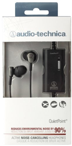Studio : audio-technica Publisher : audio-technica Binding : Electronics Product Description ATH-ANC23 QuietPoint Active Noise-Cancelling In-Ear Headphones reduce distracting background noise by up to 90% while offering the superior sound. Engineered to create a comfortable listening environment in areas with high ambient noise, these in-ear headphones feature a miniature microphone in each earpiece that picks up ambient noise (such as traffic, air-handling systems, etc.). Electronics in the control box create a noise-cancelling wave that is 180deg. out of phase with the ambient noise. This wave acts like a noise eraser: it cancels out the annoying sounds that surround you without diminishing the audio you want to hear. The result, a peaceful enclave to enjoy the music or movies of your choice. 0