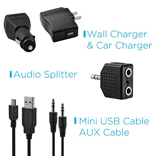 Includes Bluetooth speaker, Mini USB cable, wall charger, car charger, cleaning cloth, carrying pouch, aux cable and audio splitter