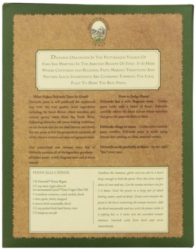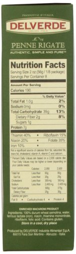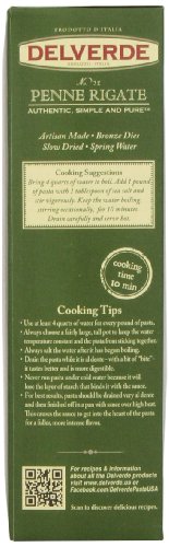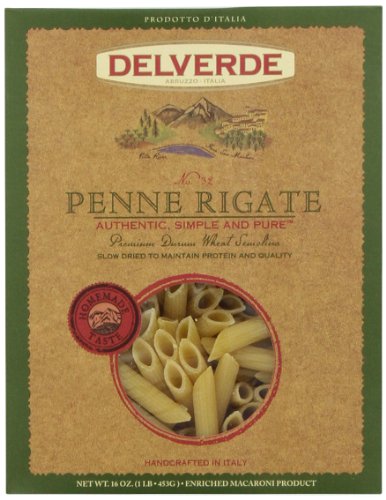 -. Binding : Grocery -. Brand : Delverde -. Feature : Pasta Made of Semolina. / Made in the Majella National Park, Italy. / Produced with pure, natural sP.R.Ing water. / Slowly dried the old fashioned way. -. Label : Delverde Pasta -. Manufacturer : Delverde Pasta -. MPN : 077908620326 -. NumberOfItems : 12 -. PackageQuantity : 12 -. PartNumber : 077908620326 -. ProductGroup : Grocery -. ProductTypeName : GROCERY -. PublicationDate : 2012-03-16 -. Publisher : Delverde Pasta -. Studio : Delverde Pasta -. Title : Delverde Penne Rigate, 1-Pound (Pack of 12)