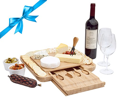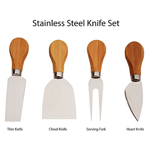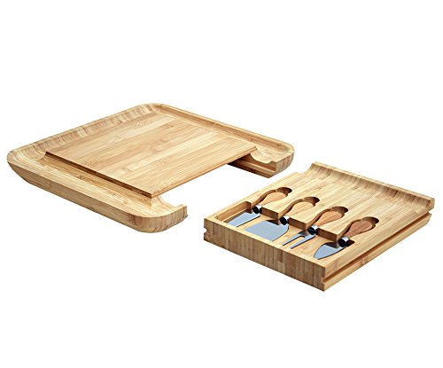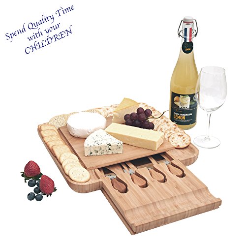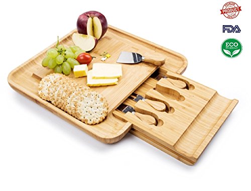 100% ORGANIC BAMBOO - Bamboo is a hard grass; it is a sustainable, renewable resource that needs no chemicals to be harvested. This product includes slide-out drawer with 4 stainless steel cheese cutlery.