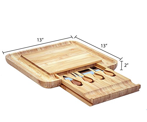 Premium Bamboo Cheese Board with Stainless Steel Knife Set | Great Gift Idea | Size 13''x13''x2''