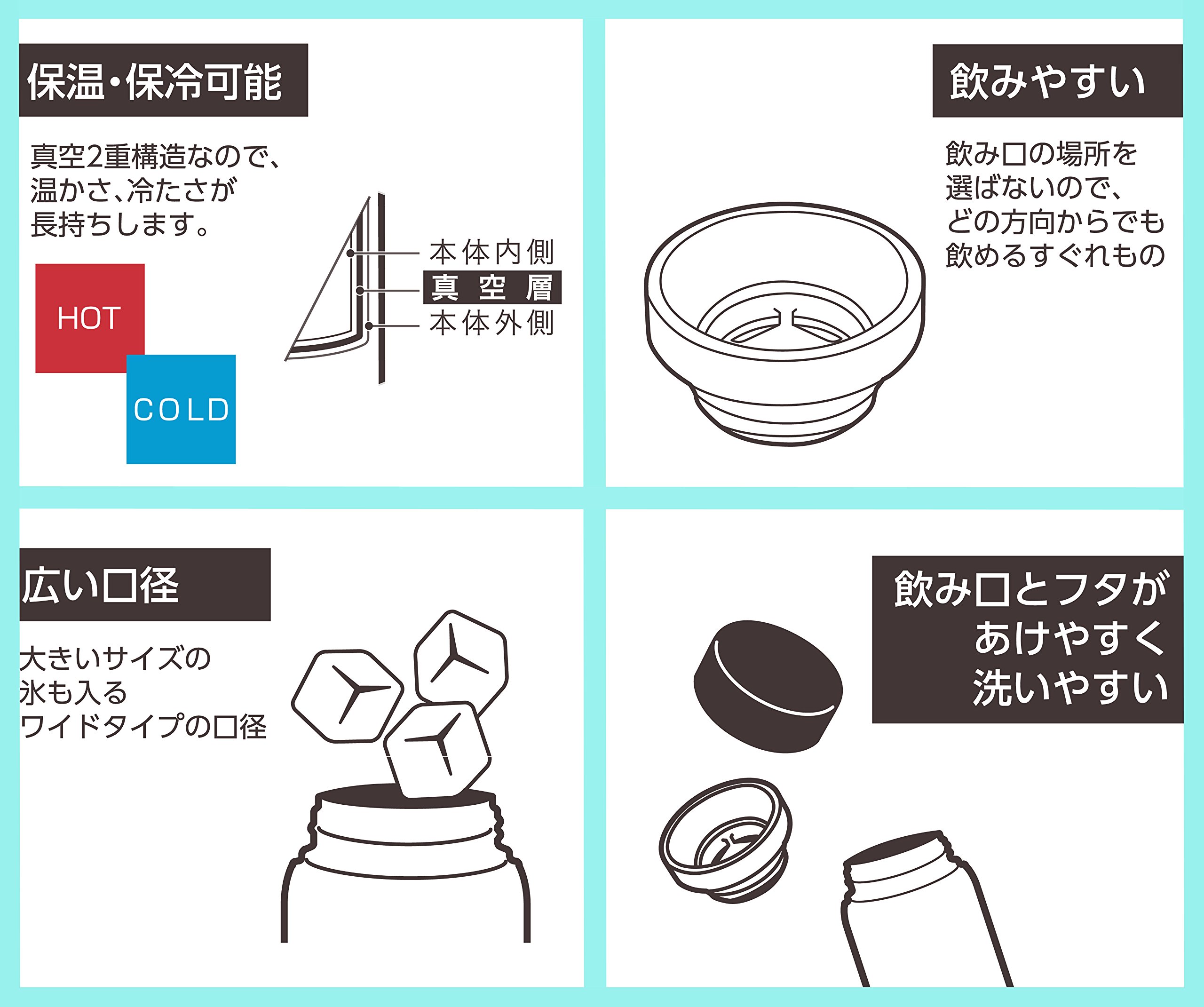 ● Since it is a vacuum insulating double-layer structure, keep the temperature around the drink when you drink.