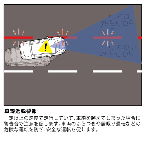 ●一定以上の速度で走行していて、車線を越えてしまった場合に警告音で注意を促します。