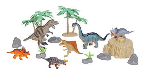 -. Feature : Includes 15 total pieces: 6 Dinosaurs, 2 Trees, 1 Mountain, and 6 Rocks / Realistic looking components / Storage bucket included / Great for hours of pretend play / Great for indoor or outdoor play