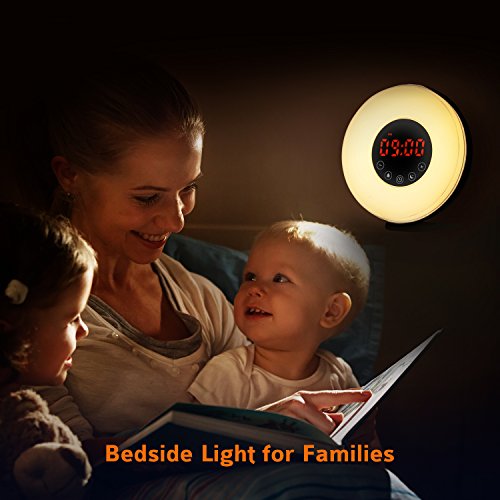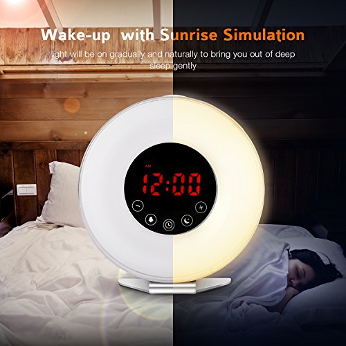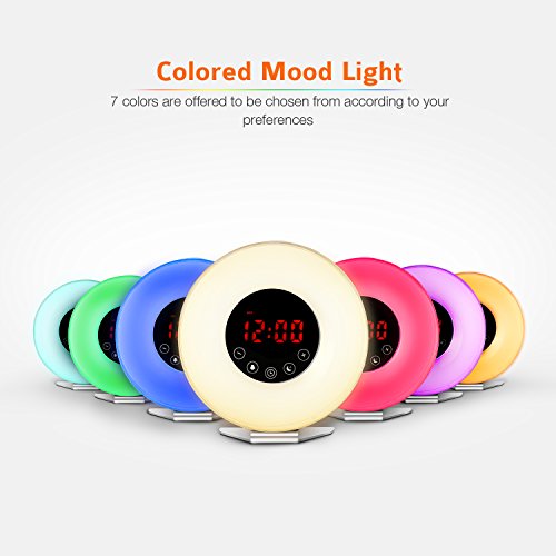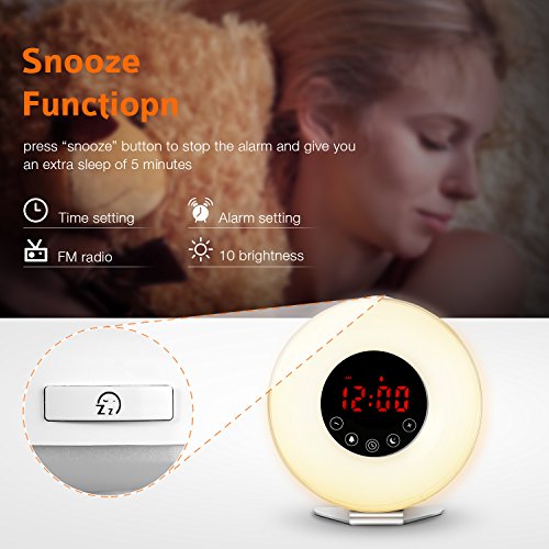 Colarful Sunrise Wake Up Light Sunset/Sunrise Simulation Wake Up Light 30 mins before alarm/sunset time, the sunrise/sunset simulation white light will be bright/dark gradually. Sleeply more than a while At the alarm time, the alarm sound will plays for 2 minutes, Press button "SNOOZE" enter the snooze mode, the wake up sound will play again after 5 minutes and last 2 minutes. Customize your bedside lamp light Chose one of a 7 colorful(Warm White, Green, Red, Blue, Purple, Orange, Indigo) and 10 brightness levels.