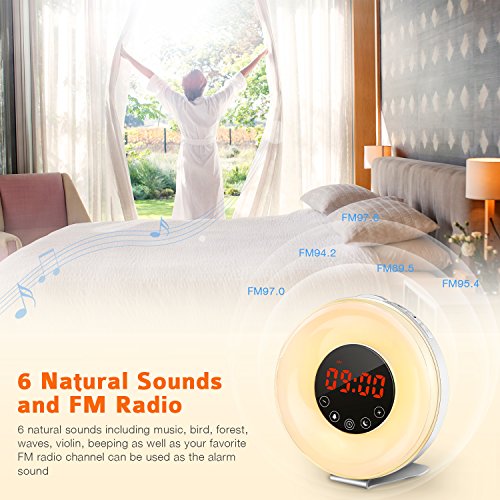 NATURAL CLOCK SOUNDS AND FM RADIO: Enjoy 6 natural sounds such as pure music, birds,waves,forest, beeping and so on, which let you revel in the sounds and smells of the nature. Also, you can set your favorite FM radio channel as the alarm sound.