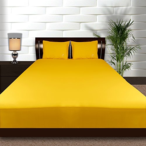 PACKAGE CONTENT : Pack Consists of 1 european king flat bedsheet 98 x 116 inches, 1 european king fitted bedsheet 72 x 80 x 14 inches and 2 pillow covers 20 x 30 inches. this sheet set is also suited for uk / ireland super king & australian king beds. package comes with a specially designed reusable outer fabric envelope for an elegant and neat look. ; COLOR : Mimosa (14-0848 TPX)