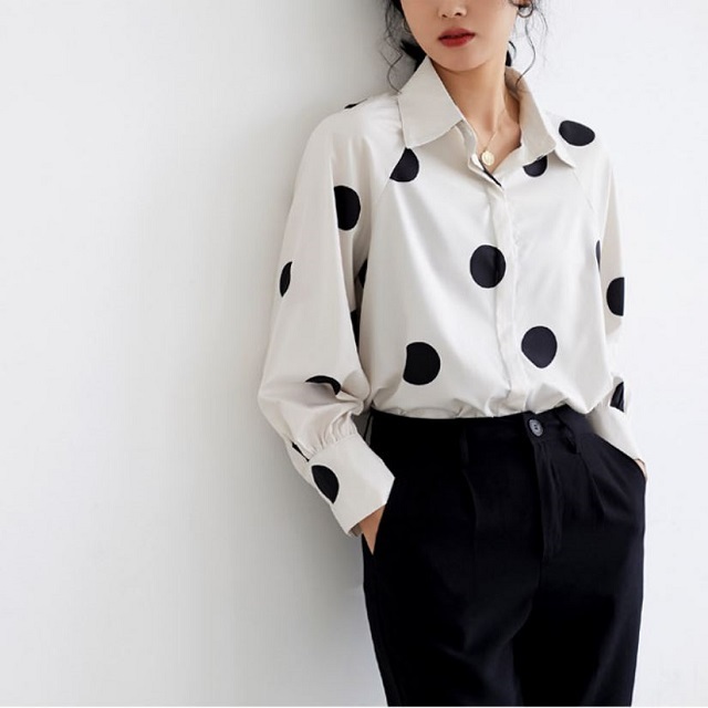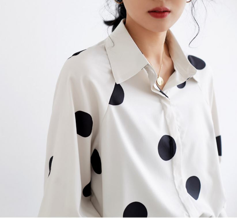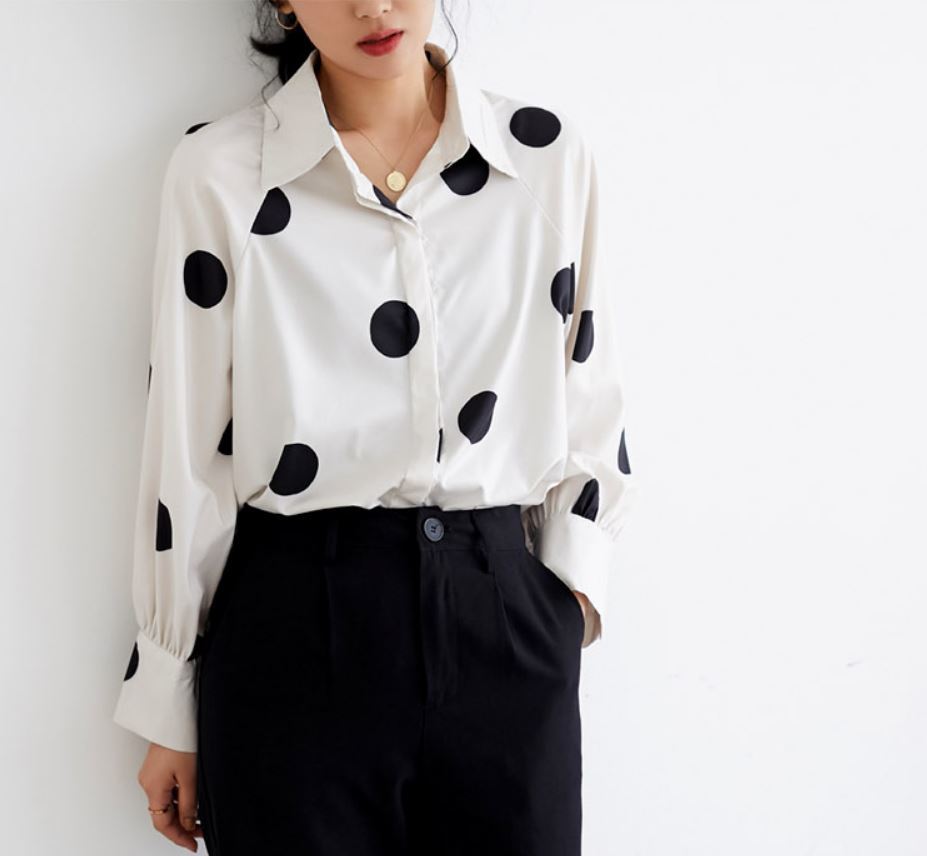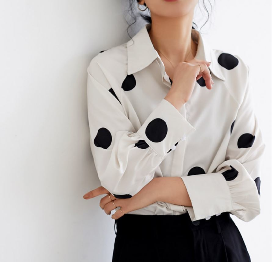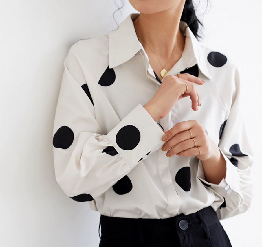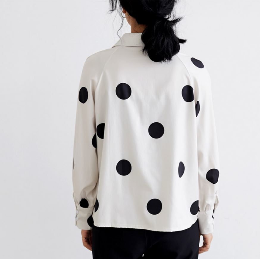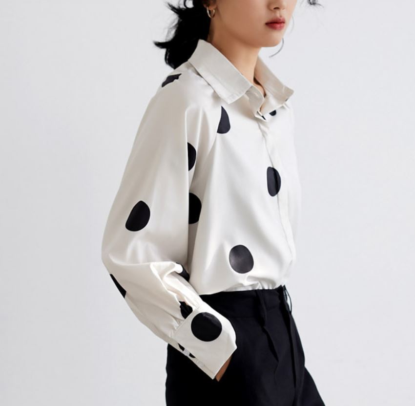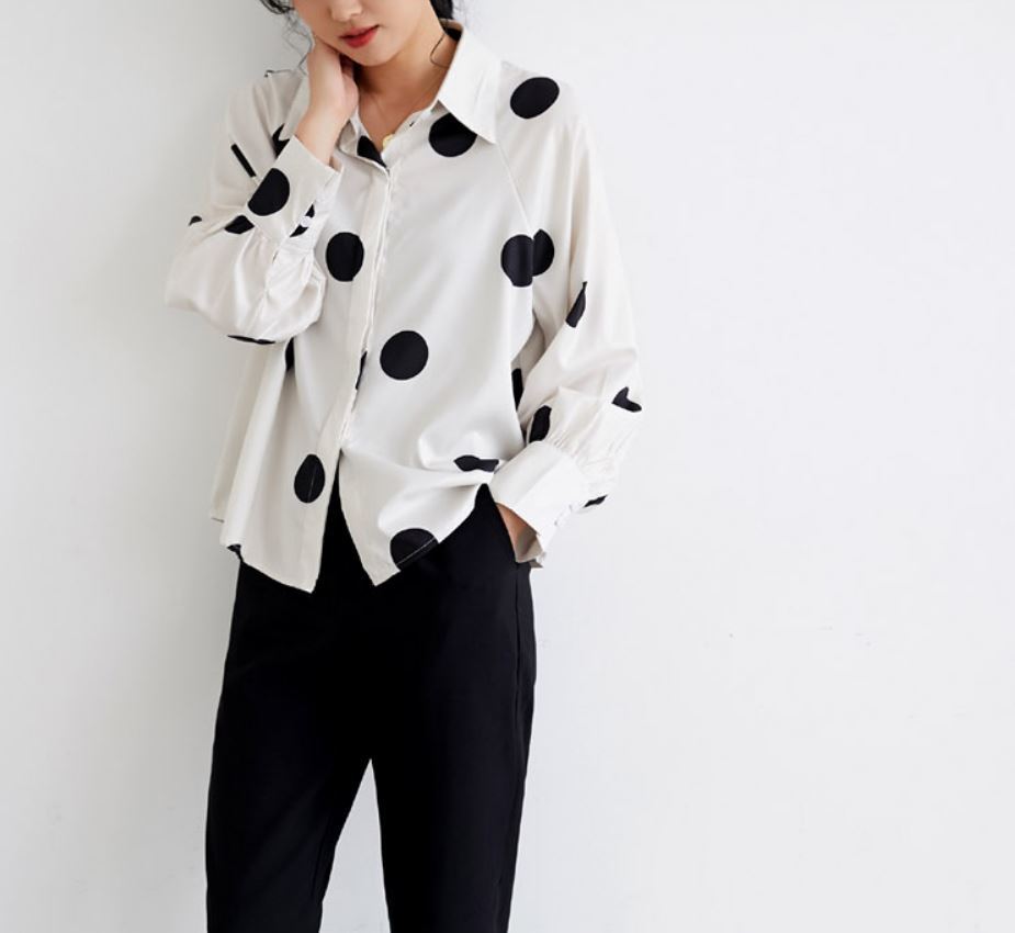 大き目のドット柄がインパクト大で、とってもオシャレなモノトーンシャツ☆