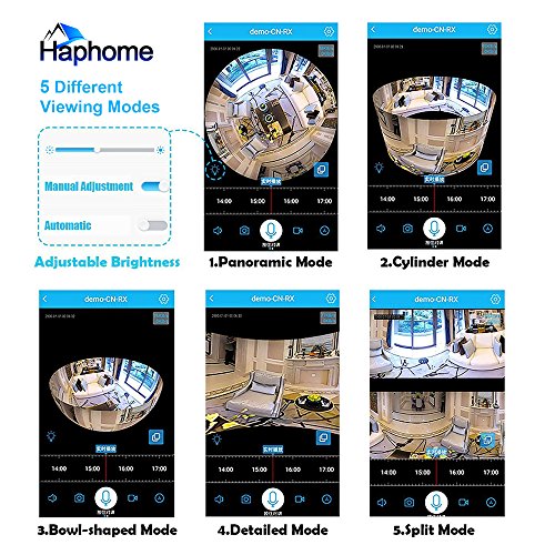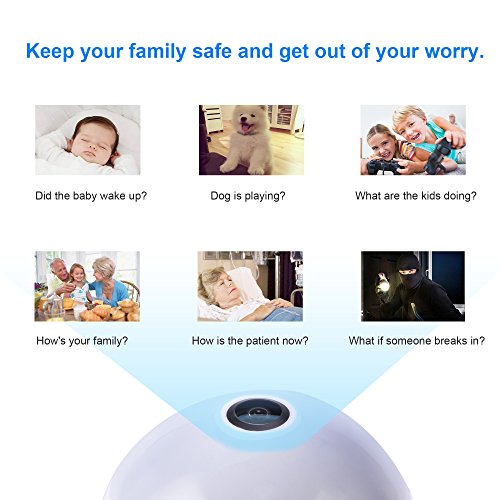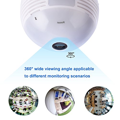 - ✔️WIDE VIEW ANGLE: 360-Dgree wide view angle, no blind area with 960P high resolution, applicable to different monitoring scenarios, supporting 5 different viewing modes and loop recording in the micro SD card(up to 128GB).