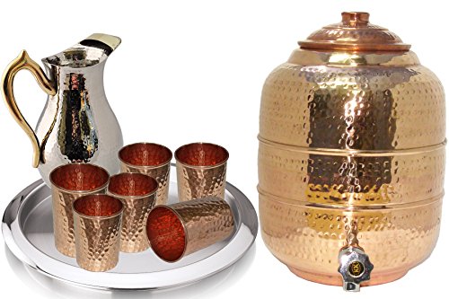-. Title : King International Copper Water Tank,6 Copper Hammered Glasses & 1 Copper & Steel Jug And 1 Steel Tray,Set Of 9 Pieces