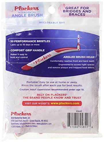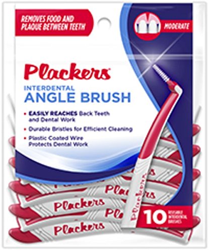 Studio : Plackers Publisher : Plackers Binding : Health and Beauty Product Description 10 count interdental angled brushes, great for bridges and braces and angled brush head comfortable reaches front and back teeth. Engineered to access tight spaces, remove plaque and unsightly debris. Comfort grip, flexible brush head and durable bristle strength, again great for reaching back teeth. Hi performance bristles last for 10 days or more, available in a convenient reclose able 10 count package. 0