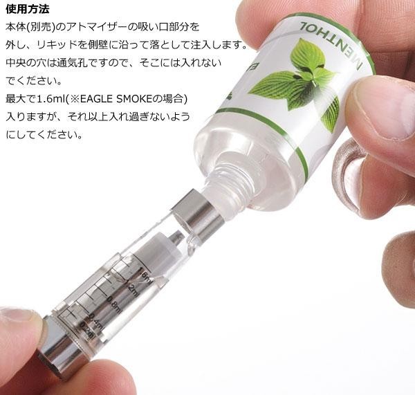 禁煙・節煙をサポートする電子タバコ、EAGLESMOKE(イーグルスモーク)専用のリキッドです。グリセリンを主成分として作られており、タールや発がん物質を含みません。また、部屋や車内にも嫌な臭いが残りません。オーソドックスなメンソールは鼻やのどがスッとし、王道のタバコ味は禁煙や節煙されたい方におすすめです。また、エミリやシルバーマッチの電子タバコにも使用可能なリキッドです。 |