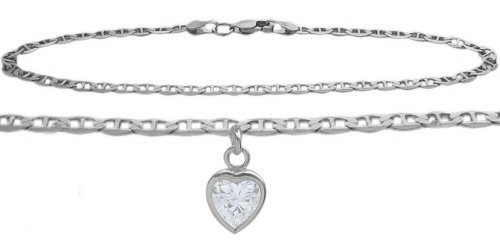 -. Title : 14K White Gold Mariner Anklet with Genuine White Topaz Heart Charm
