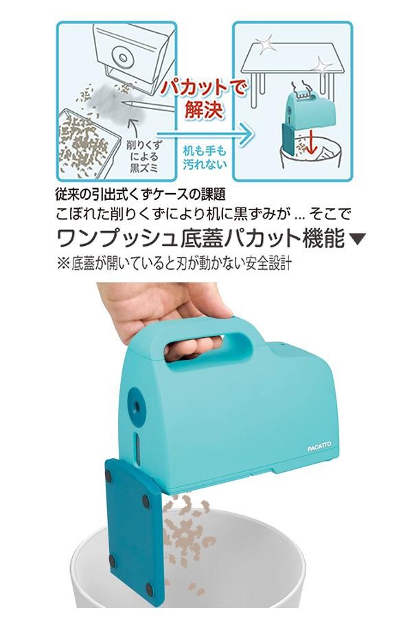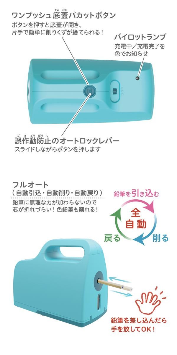 片手でワンプッシュ!!削りくずを直接ゴミ箱にパカッと捨てられる机を汚さない自動鉛筆削り器です。持ち運びに便利なグリップとコンセントが無くても使える充電式なので、リビングや子供部屋など、使用シーンを選びません。 |