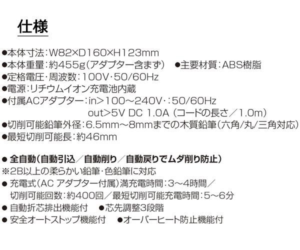 | 片手でワンプッシュ!!削りくずを直接ゴミ箱にパカッと捨てられる机を汚さない自動鉛筆削り器です。持ち運びに便利なグリップとコンセントが無くても使える充電式なので、リビングや子供部屋など、使用シーンを選びません。 |