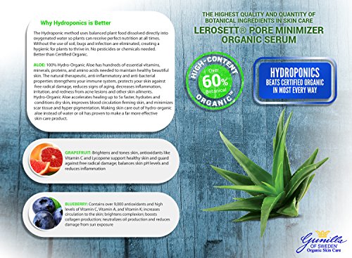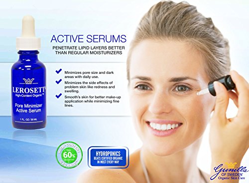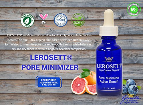 -. Binding : Misc. -. Brand : Gunilla Of Sweden -. EAN : 0856540005049 -. Feature : Quickly minimizes pore size / Minimizes the side effects of problem skin like uneven skin tone, redness, and discoloration / Smooths skin for better make-up application while minimizing fine lines. Excellent make up primer / Active serums penetrate lipid layers better than regular moisturizers -. Label : Gunilla of Sweden® Organic Skin Care Since 1987 -. Manufacturer : Gunilla of Sweden® Organic Skin Care Since 1987 -. MPN : 2050 -. PackageQuantity : 1 -. PartNumber : 2050 -. ProductGroup : Beauty -. ProductTypeName : BEAUTY -. Publisher : Gunilla of Sweden® Organic Skin Care Since 1987 -. Studio : Gunilla of Sweden® Organic Skin Care Since 1987 -. Title : LEROSETT® Pore Minimizer Organic Serum 1 oz: Based on Nutrient Rich Organic Aloe- Glycolic Acid- Blueberry Extracts- Antioxidant and Phytonutrient Rich with Vitamin C, Vitamin A and Vitamin K- Exfoliates- Moisturizes- Reduces Pores -. UPC : 856540005049