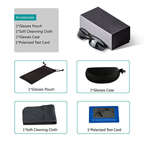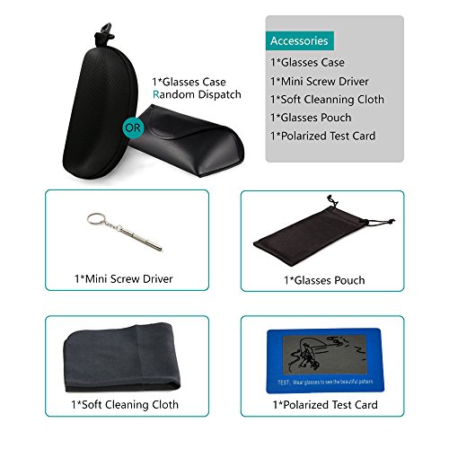 Includes: -1 X Sunglasses -1 X Case -1 X Glasses Cloth -1 X Glasses Bag -1 X Glasses Screwdriver -1 X Polarized Sunglasses Test Card