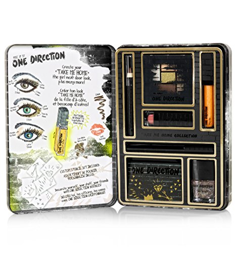 The Take me Home Beauty Collection Kit includes limited-edition makeup by One Direction. A collection of beauty essentials housed in a collectible keepsake tin. Inside is everything you need to rock all your beauty looks on or off the stage. Eye Palette features "Back For You" (velvet creme), "Change My Mind" (peachy shimmer), "C'mon C'mon" (soft taupe), "Little Things" (smoky brown), "Take Me Home" (golden glitter creme).Feature